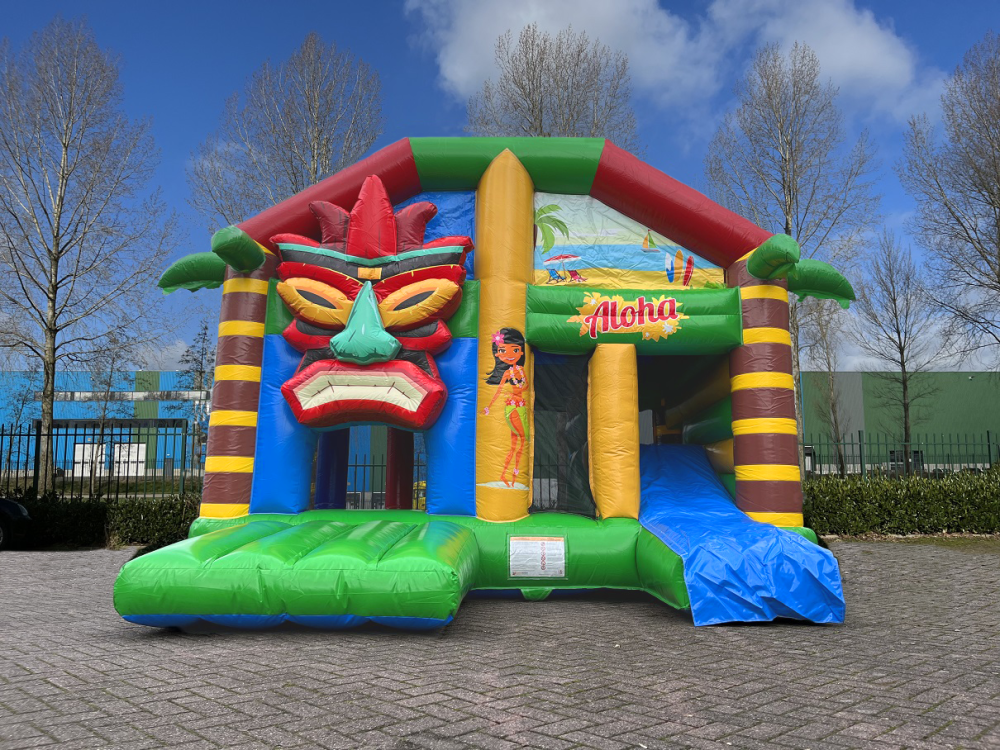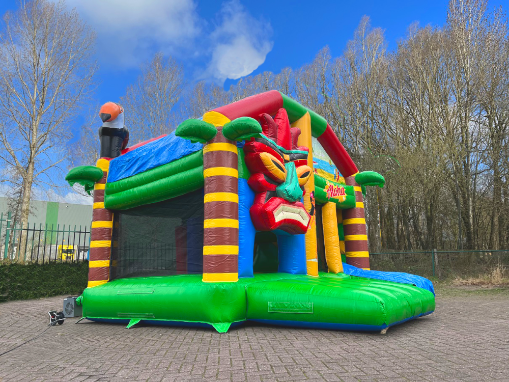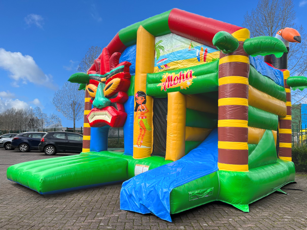 This beautiful bouncer multiplay Hawai with roof is a real eye-catcher. You don’t have to worry about rain or sunshine because that’s what the roof is for. Because the bouncy castle is covered, it can always be used. Besides the fact that the roof protects against rain and sunshine, it is also an extra safety aspect. It makes it impossible for the kids to fall out when the climb on top of the sidewalls.