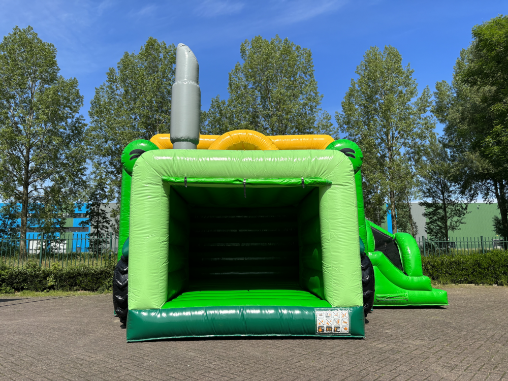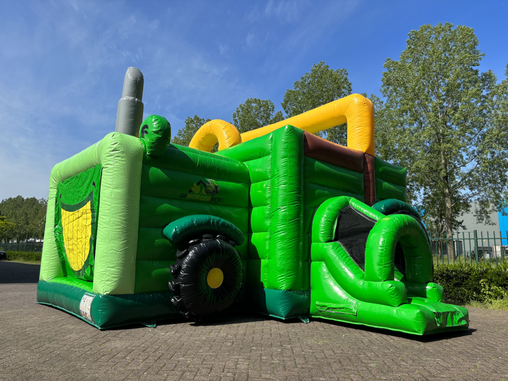 We have produced a custom-made bouncy castle in the shape of a tractor for Norgerberg campsite. Camping de Norgerberg is a campsite that also offers recreation to the younger target group. They asked us to design a bouncy castle in the shape of a tractor for the young visitors, which the campsite regularly uses during high season to entertain the children. This model bouncy castle has an entrance with a jumping area and slide.