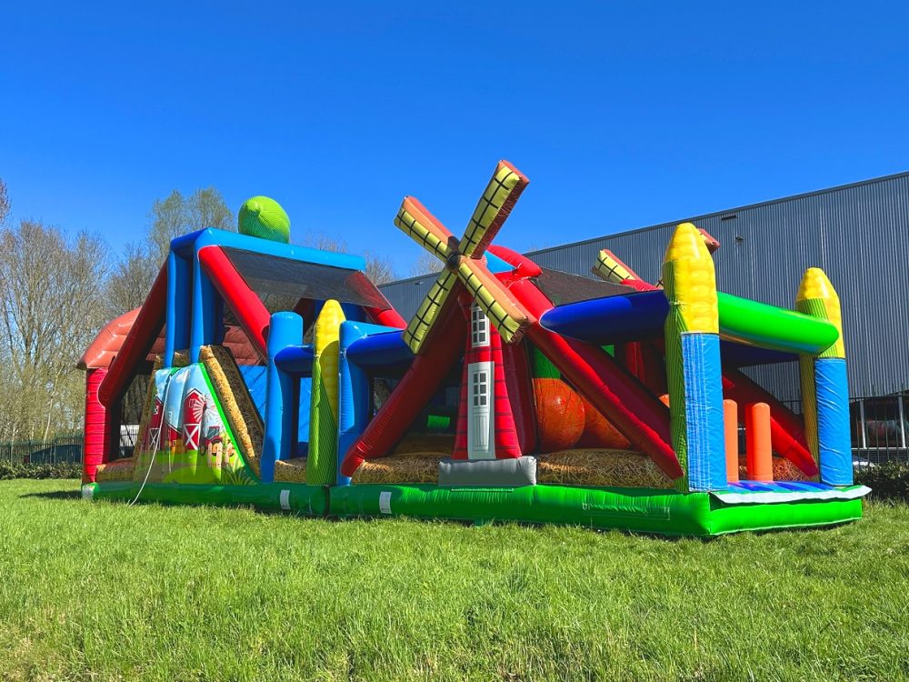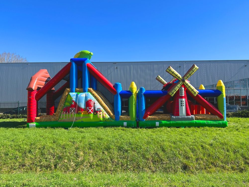 This Modular Obstacle Course Farm 13.5 meters is a challenge for young and old. Climb up the climbing blocks and slide down again. Then there are two inflatable horizontal tubes that you have to go through. Push the balls to the side and through the inflated posts. This survival course has a beautiful print on the side and a corn cob on top, giving it a fresh look.