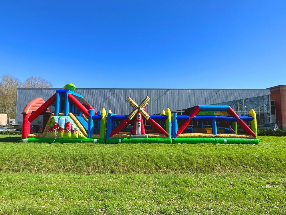 This Modular Obstacle Course Farm 21.5 meters is a challenge for everyone. Climb up the climbing blocks and slide down again. Then there are two inflatable horizontal tubes that you have to go through. Push the balls to the side and through the inflated posts. Then you arrive at the ‘walk over walls’. Try to get across here without falling off the blown up blocks!