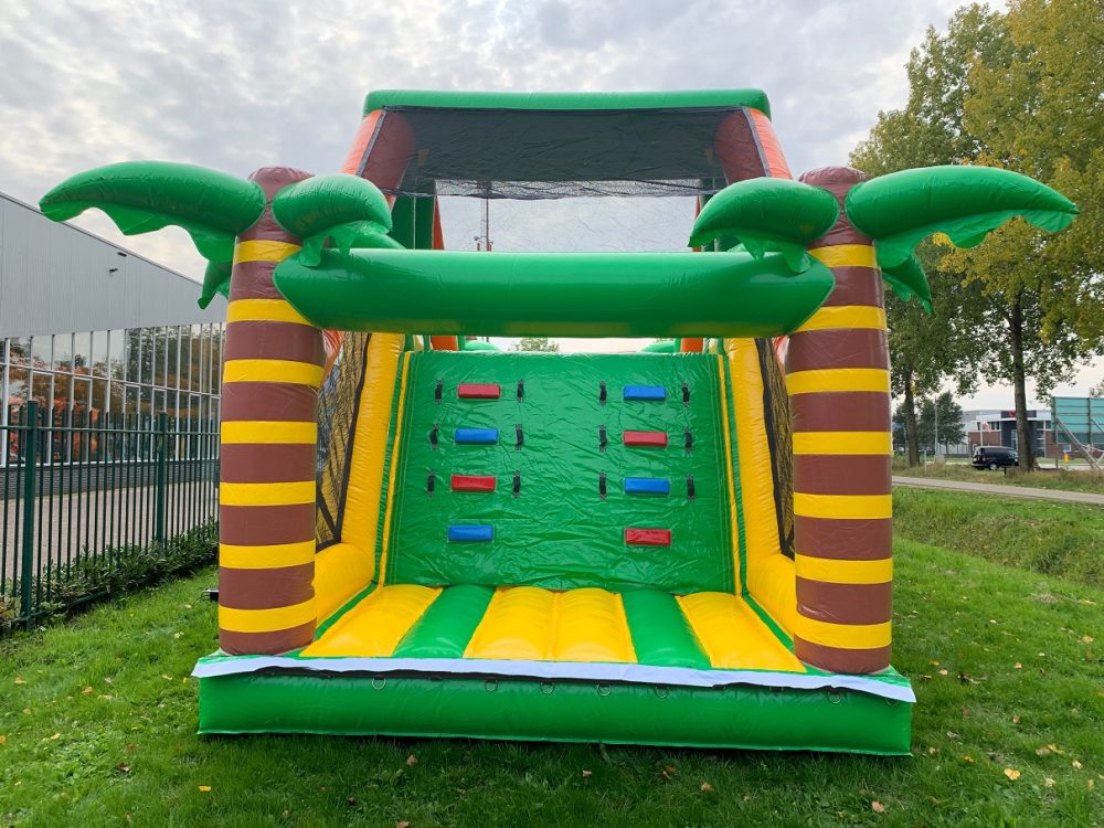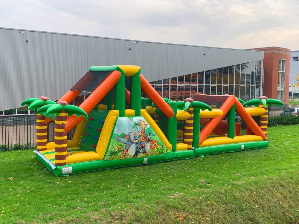This Modular Obstacle Course Jungle 13.5 meters is a challenge for young and old. Climb up the climbing blocks and slide down again. Then there are two inflatable horizontal tubes that you have to go through. Push the balls aside and through the inflated posts. This survival track has a beautiful print on the side and therefore has a fresh look.